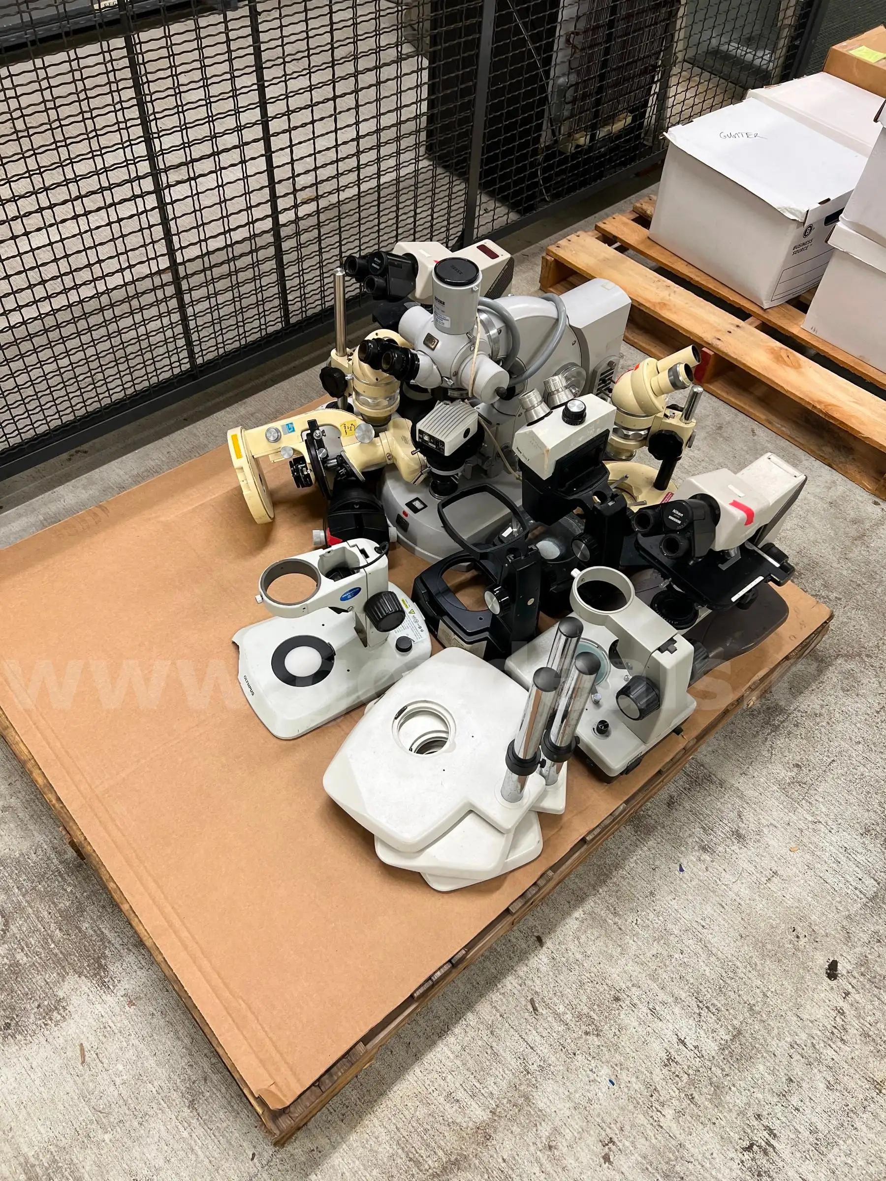 Item:Small pallet of old microscopes parts and stands.