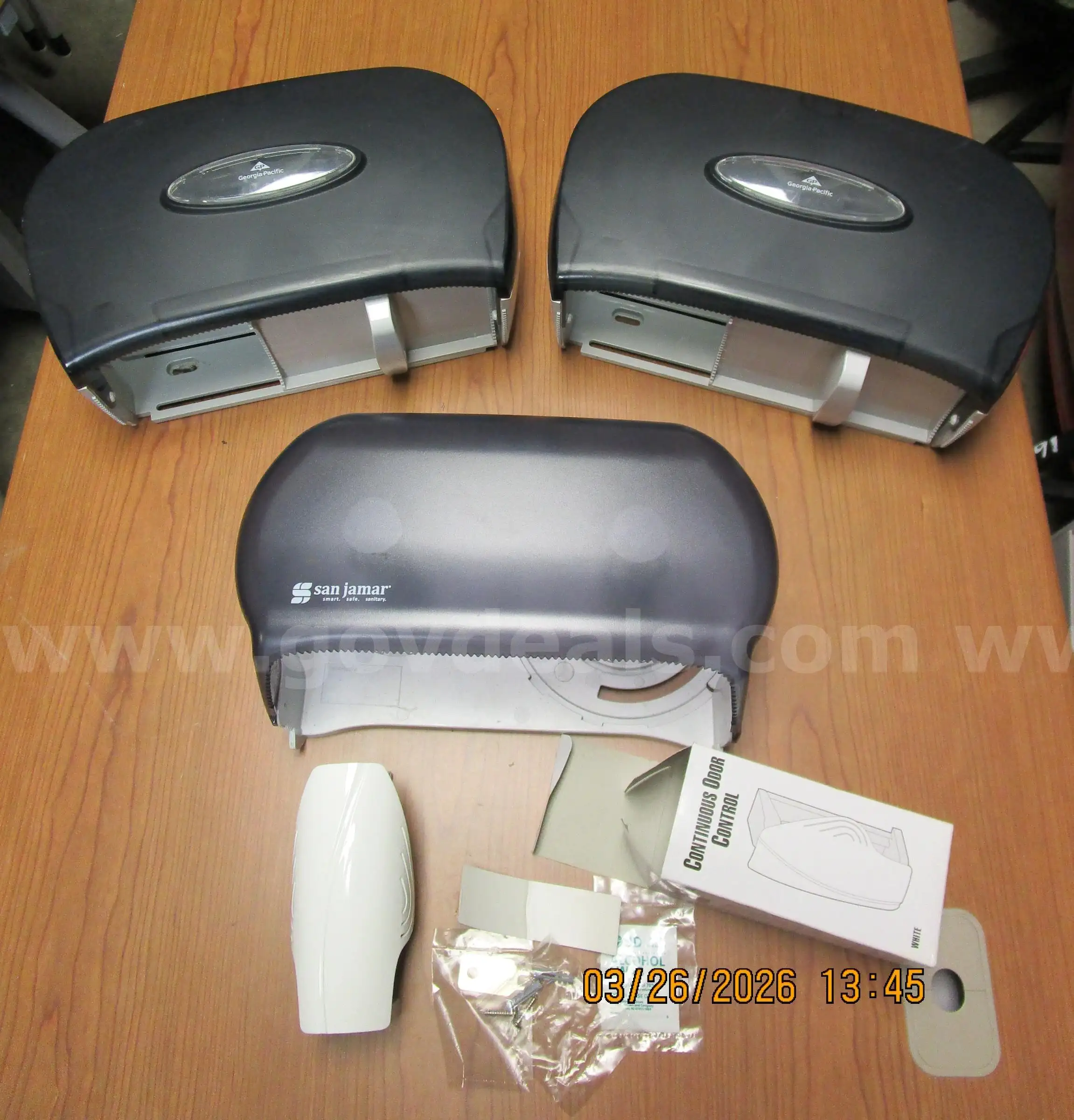 Item:LIKE-NEW (2) GEORGIA-PACIFIC & (1) SAN JAMAR DOUBLE ROLL TOILET PAPER DISPENSERS & ODOR CONTROL DEVI
