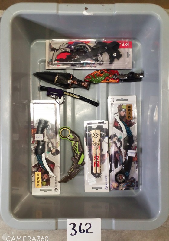 Description:TSAITEM DESCRIPTIONVARIOUS ORNAMENTAL KNIVES & MINATURESCONTENTS OF 1 PLASTIC TUB 14W X 19L X 4.5''H AS PICTUREDPLASTIC TUBS ARE STATE PROPERTY AND ARE NOT PART OF AUCTIONSWINNING BIDDER IS RESPONSIBLE FOR BRINGING CONTAINER TO PUT ITEMS IN GuidelinesPic