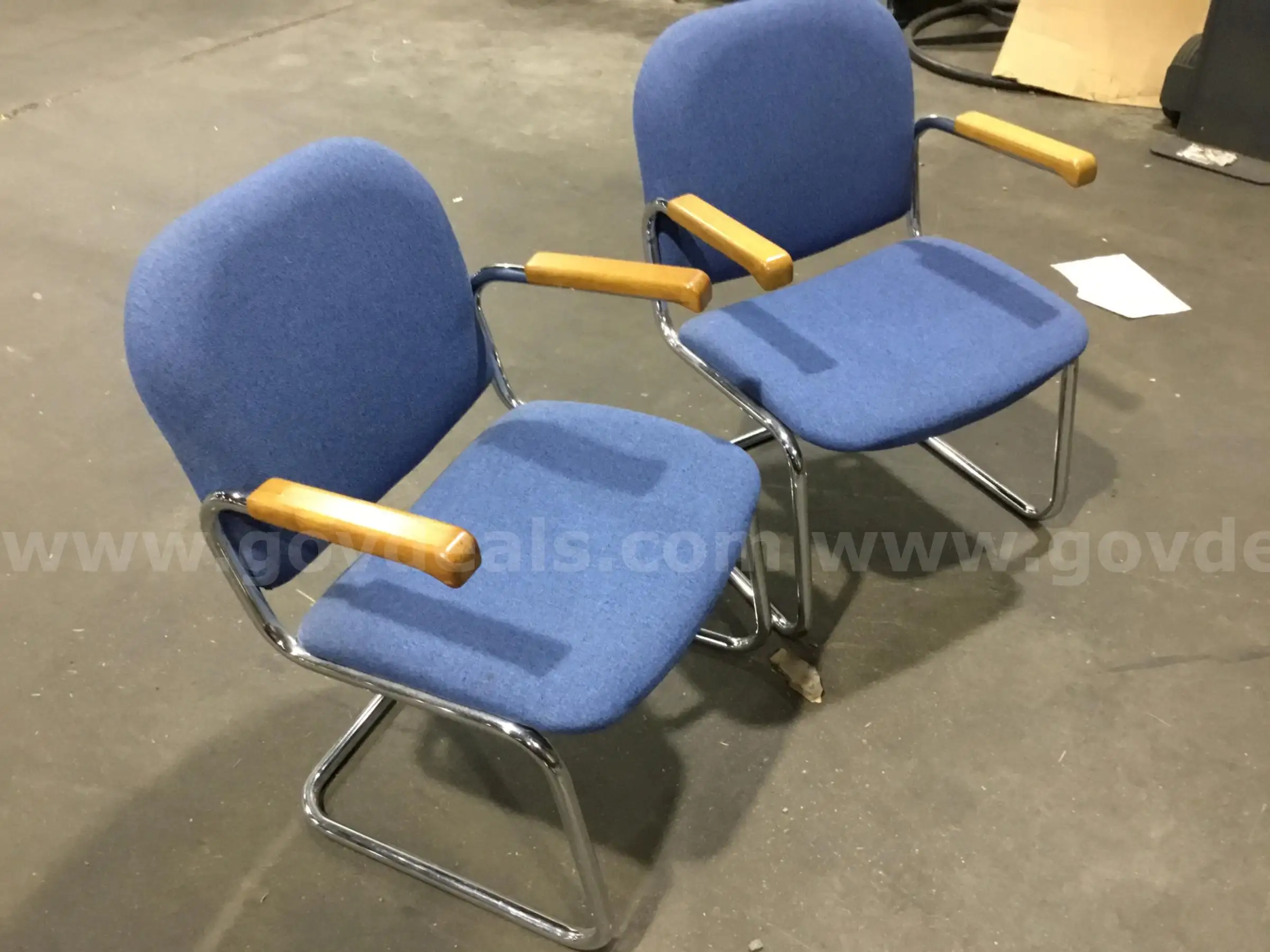 Item:Two Light Blue Cushion Chairs w wood handle arm rests and metal frame “C”