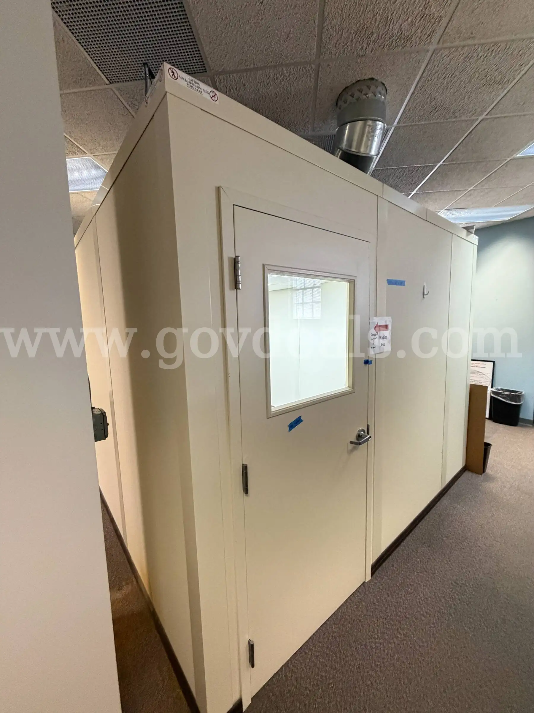 Item:Freestanding PortaFab modular office room with lighting power and enclosed workspace.