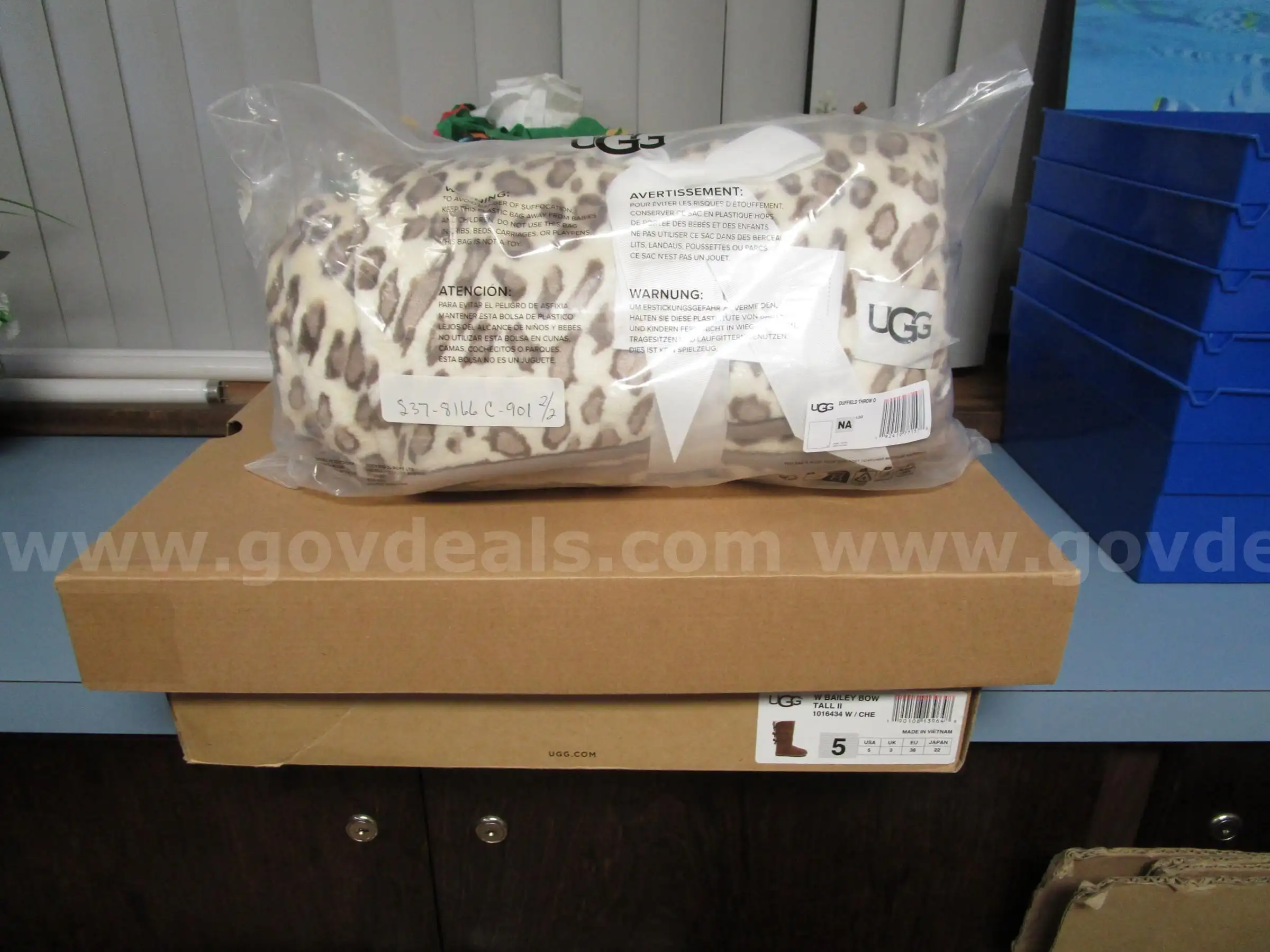 Item:(1) UNUSED PAIR UGG W BAILEY BOW TALL II SHOES SIZE 5 (1) UNUSED UGG DUFFIELD THROW
