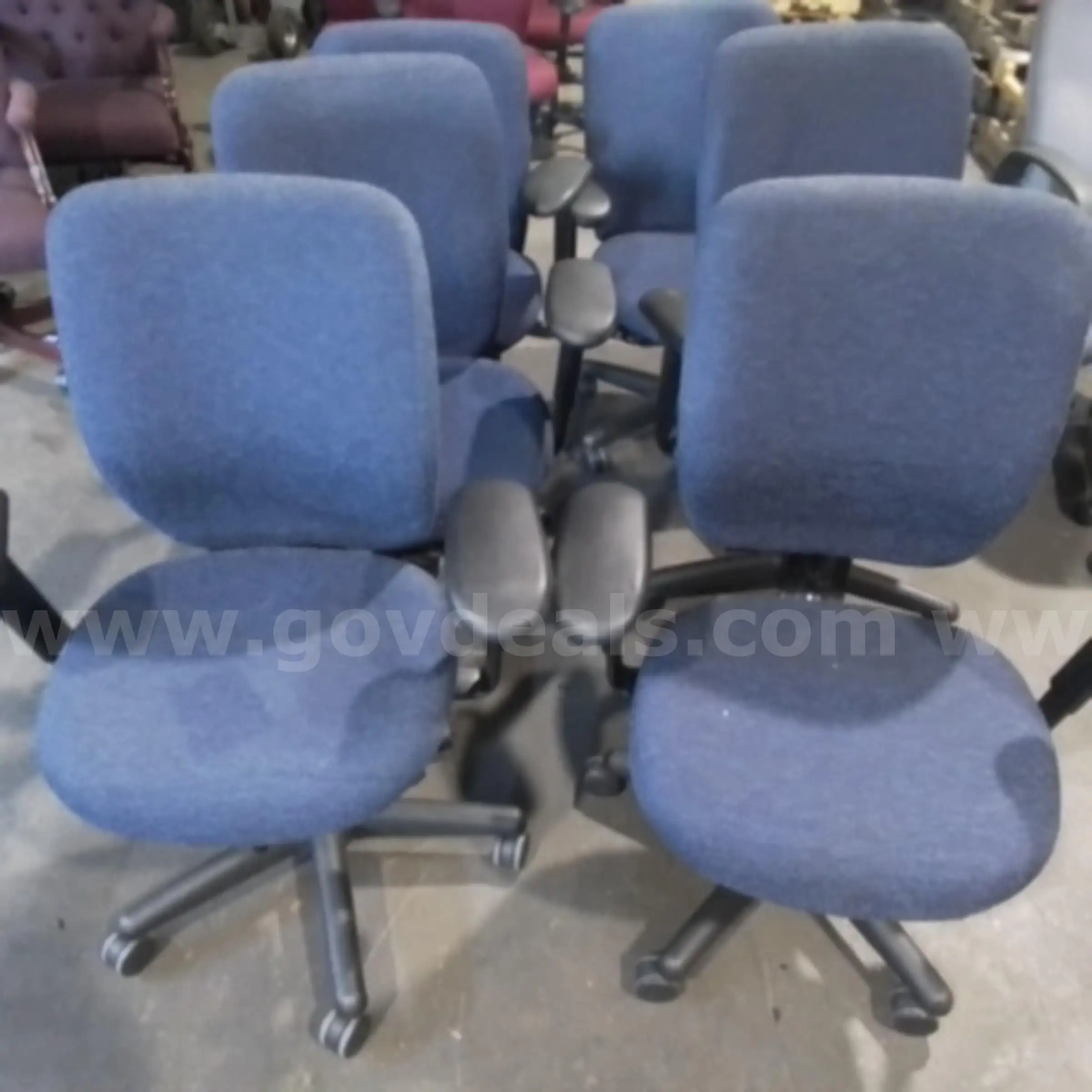 Item:Six Rolling Office Chairs with Blue Fabric and Black Arms Legs (6) JM