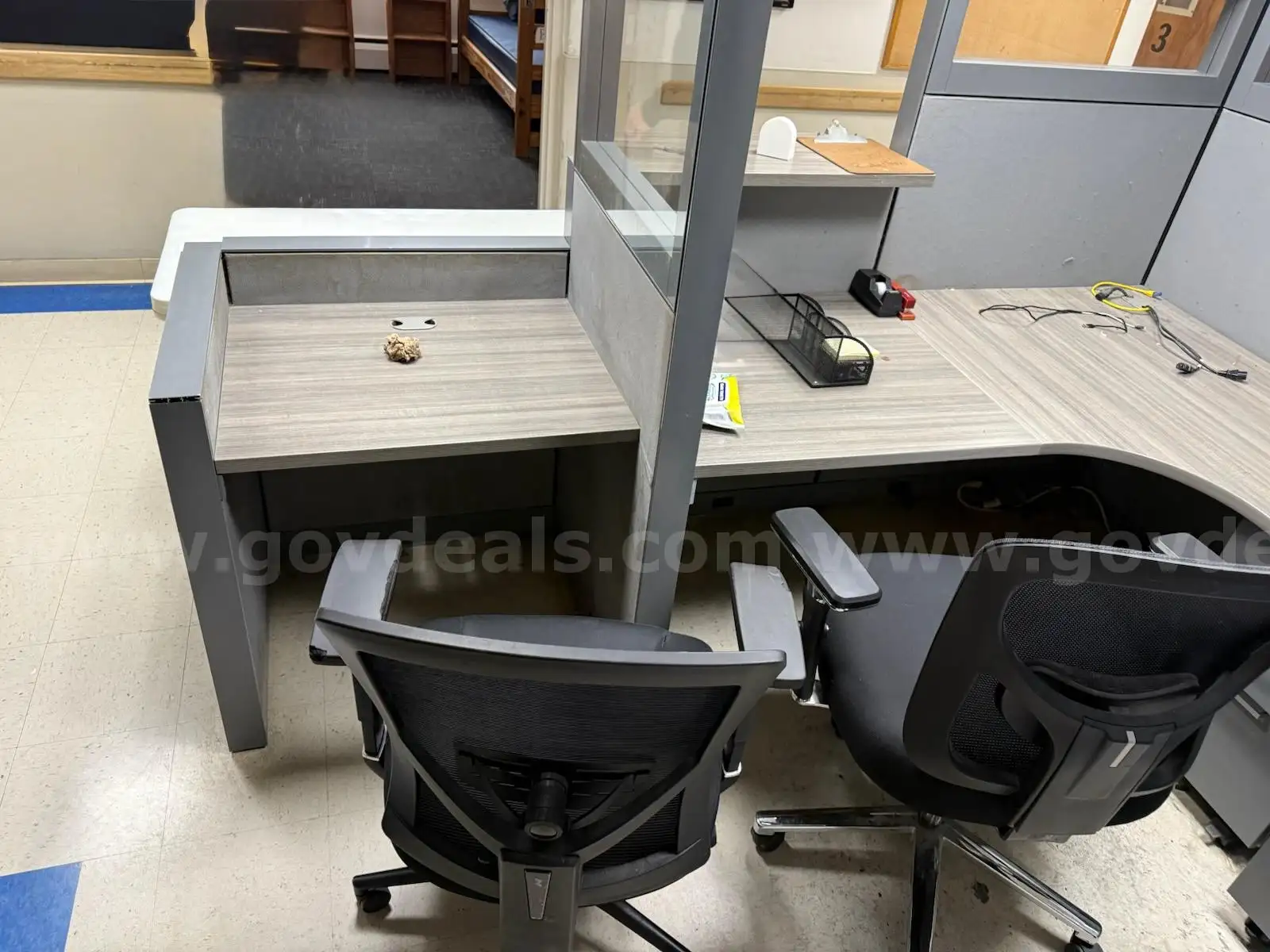 Item:Gray desk cubicle with 2 chairs