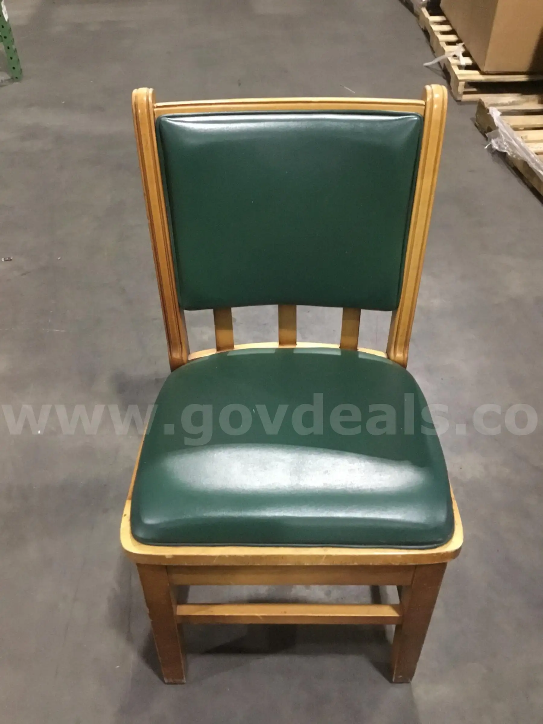 Item:Dark green armless chair with a light oak hardwood frame “DH”