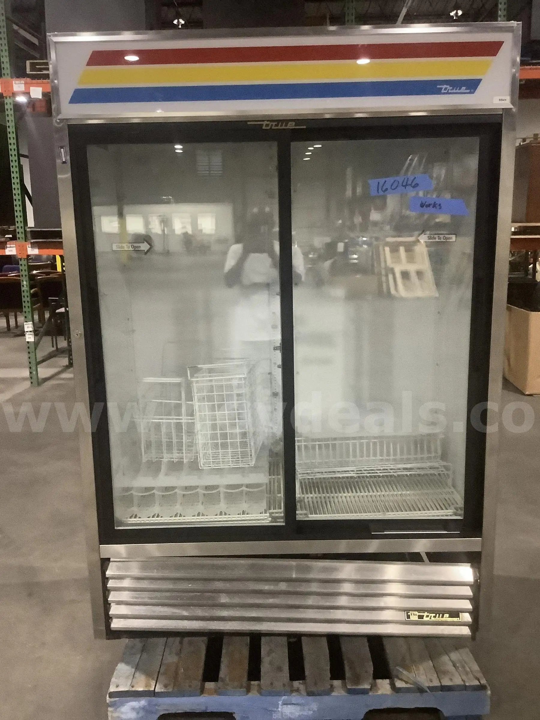 Item:54 (L) x 30 (W) x 77 (H) silver double slider door True refrigerator (IT DOES TURN ON) DH