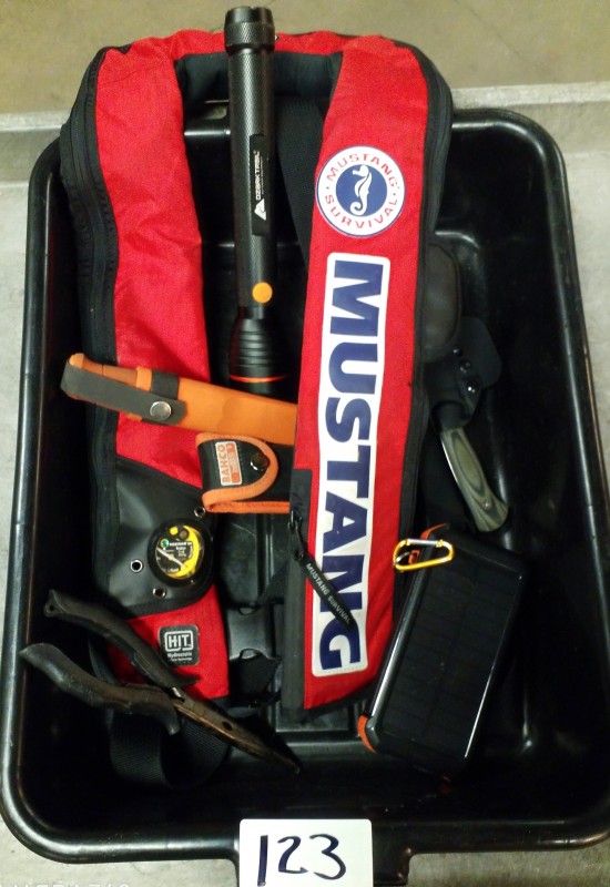Description:TSADescription: MUSTANG PFD KNIFE(S) MULTITOOL FLASHLIGHT & POWERBANK ?CONTENTS OF 1 PLASTIC TUB 14W X 19L X 4.5''H AS PICTUREDPLASTIC TUBS ARE STATE PROPERTY AND ARE NOT PART OF AUCTIONSWINNING BIDDER IS RESPONSIBLE FOR BRINGING CONTAINER TO PUT ITEMS IN