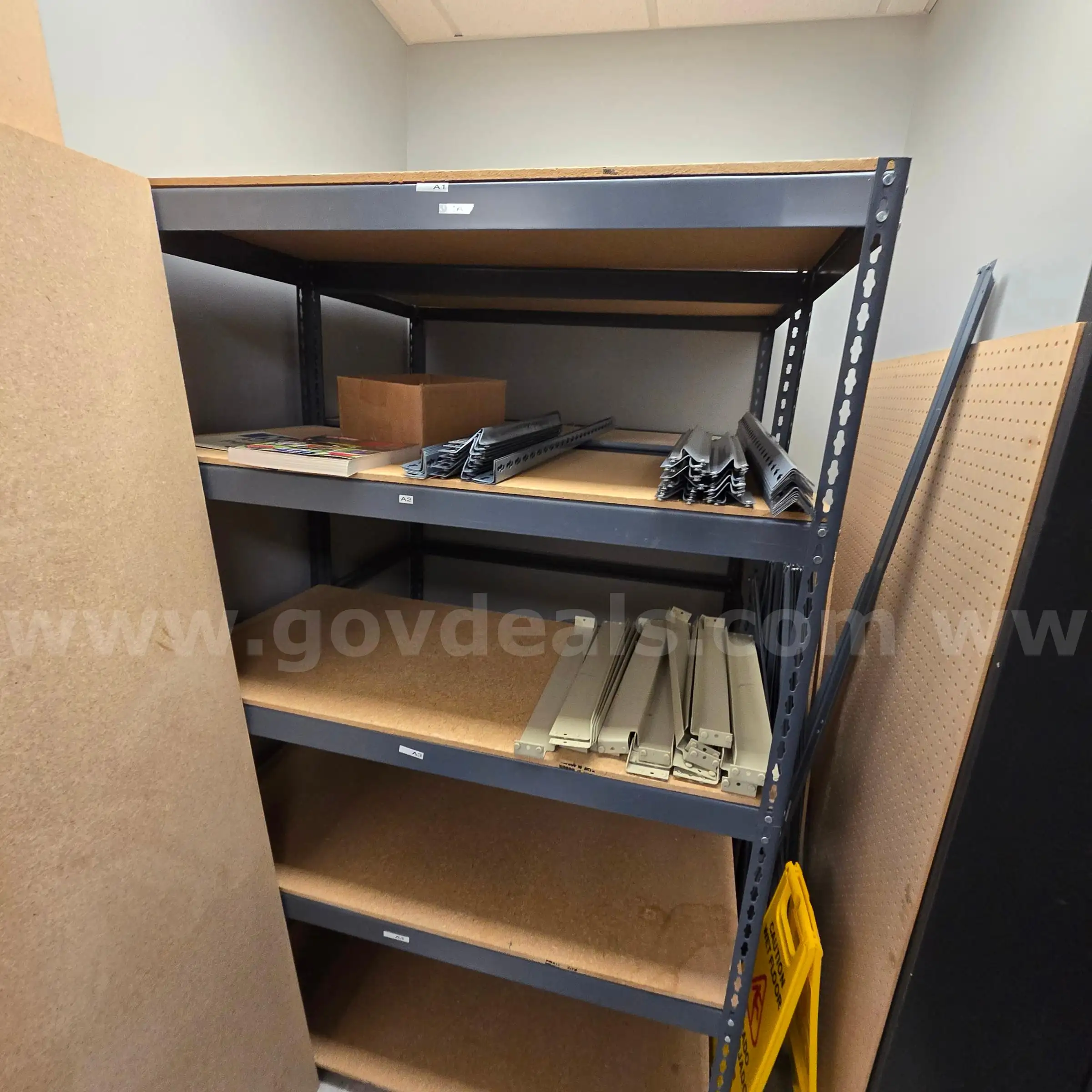 Item:5 Metal Shelving Units w wooden shelves 2 wide x 4 long x 6 high (if put together)