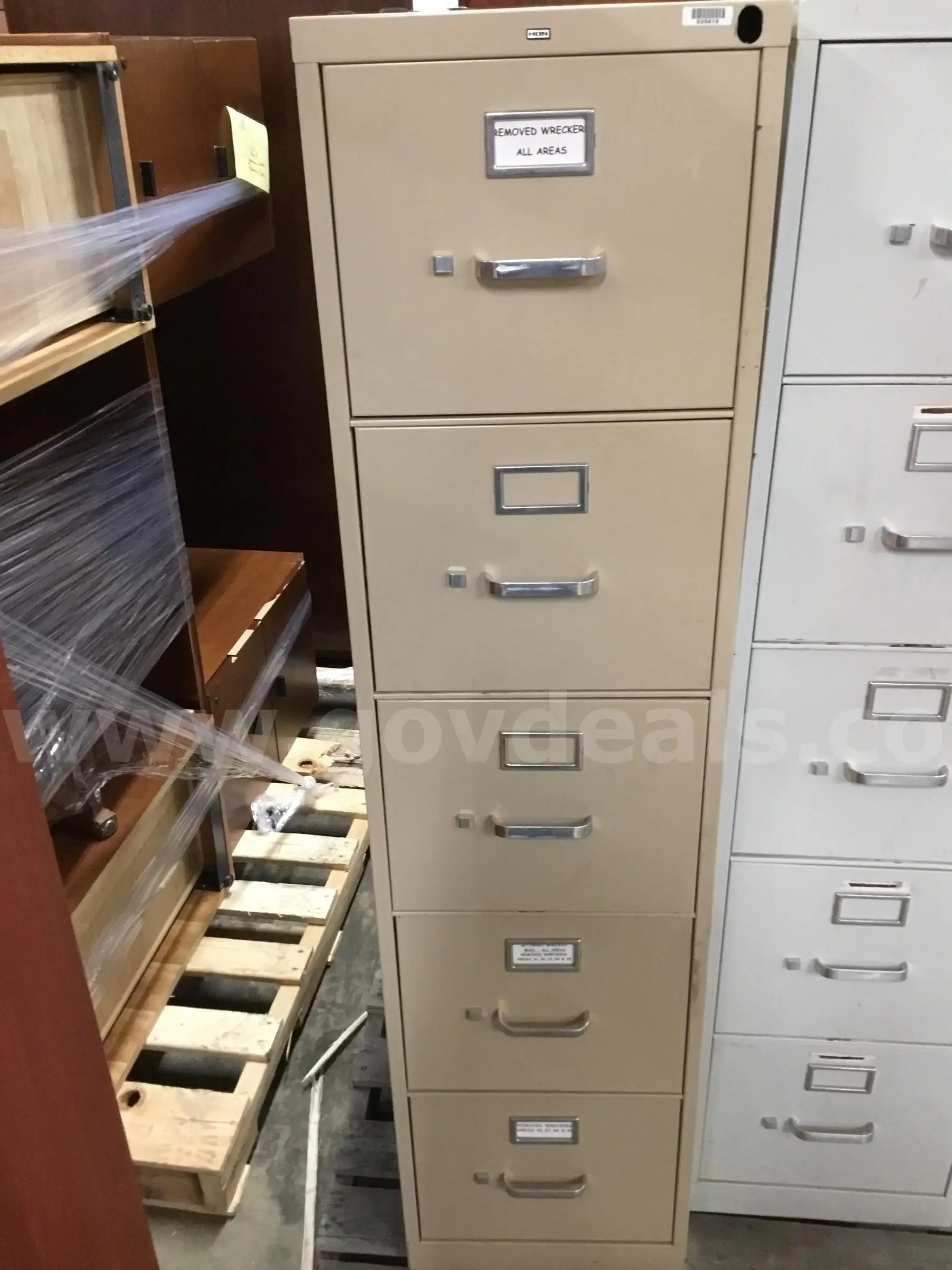 Item:26 1 2 (LENGTH) x 15 (WIDTH) x 60 (HEIGHT) light tan HON five drawer metal filing cabinet (NO KEY LO