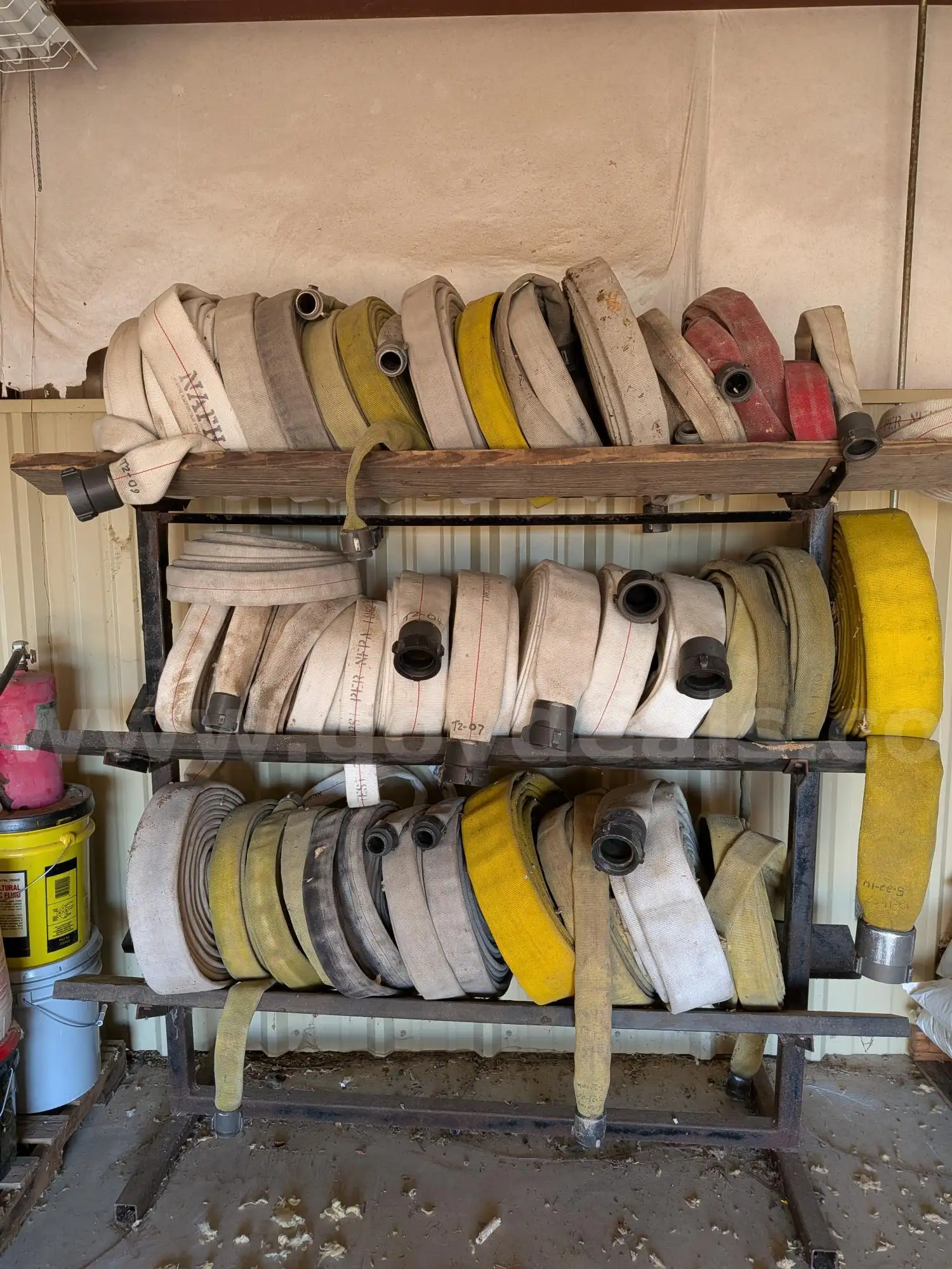 Item:Used fire equipment hoses breathing apparatus empty air tanks and other equipment