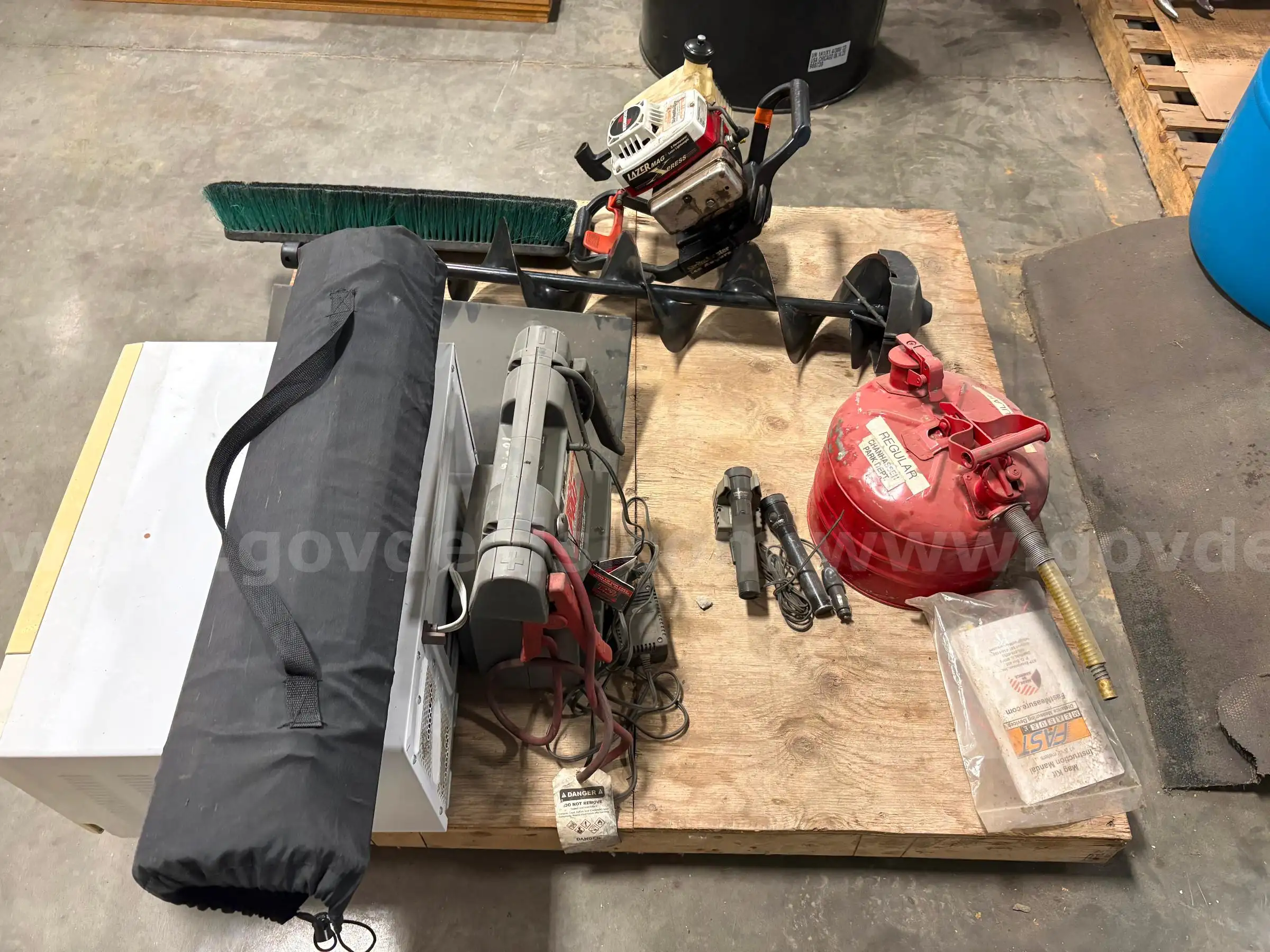 Item:Lot of Misc. Items ( Ice Auger Microwave Gas Tank Jump Pack Portable Camp Table Etc.)
