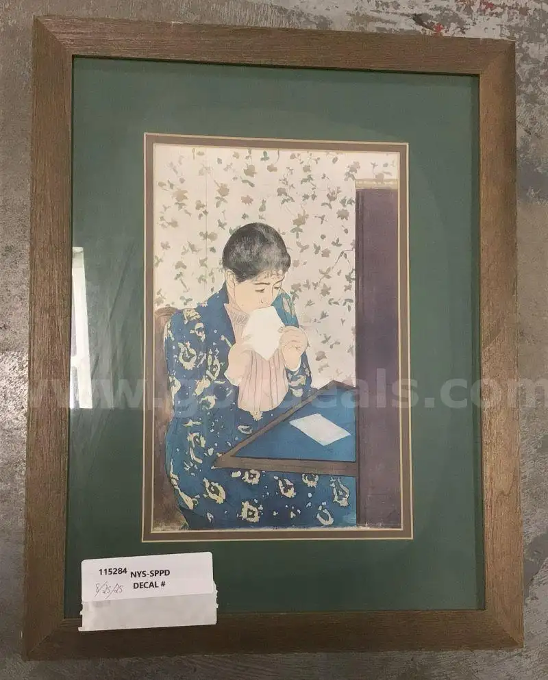 Item:Wood Framed Picture of Woman Writing Letter at Desk